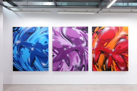 今回の個展のタイトルは「GOOD VIBES ONLY!」。100 号サイズのキャンバス4 枚は、最初に真っ⿊に塗りつぶしたあと、KAZZROCK の「DUCKLE」の特徴ある⽬元をフューチャーし、アブストラクトなラインを描きました。「フィルをぼかす」テクニックや「フェード」のバランス、⼿数の少ないところの緊張感やひっぱりあい、画⾯の中で数々のグラフィティの⽂法が余すことなく組み込まれています。
