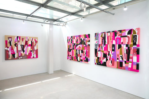 今回の個展のタイトルは「ODD ONE OUT」。仲間外れや、異質なもの、を意味する言葉で、群を描いたシリーズです。群れにいると、安心感を感じるけれども、実は意味なく安心していたり、違和感をみないふりをしたりしているのではないか。また、そこから、その群れから出る仲間はずれが現れたときに、その人に勇気づけられる人もいれば、仲間はずれにする人もいたりする。自分が、仲間はずれになったら何もおこらないか、空気をかえられるだろうか。外にでる一歩を、国という群も含め踏み出せるか